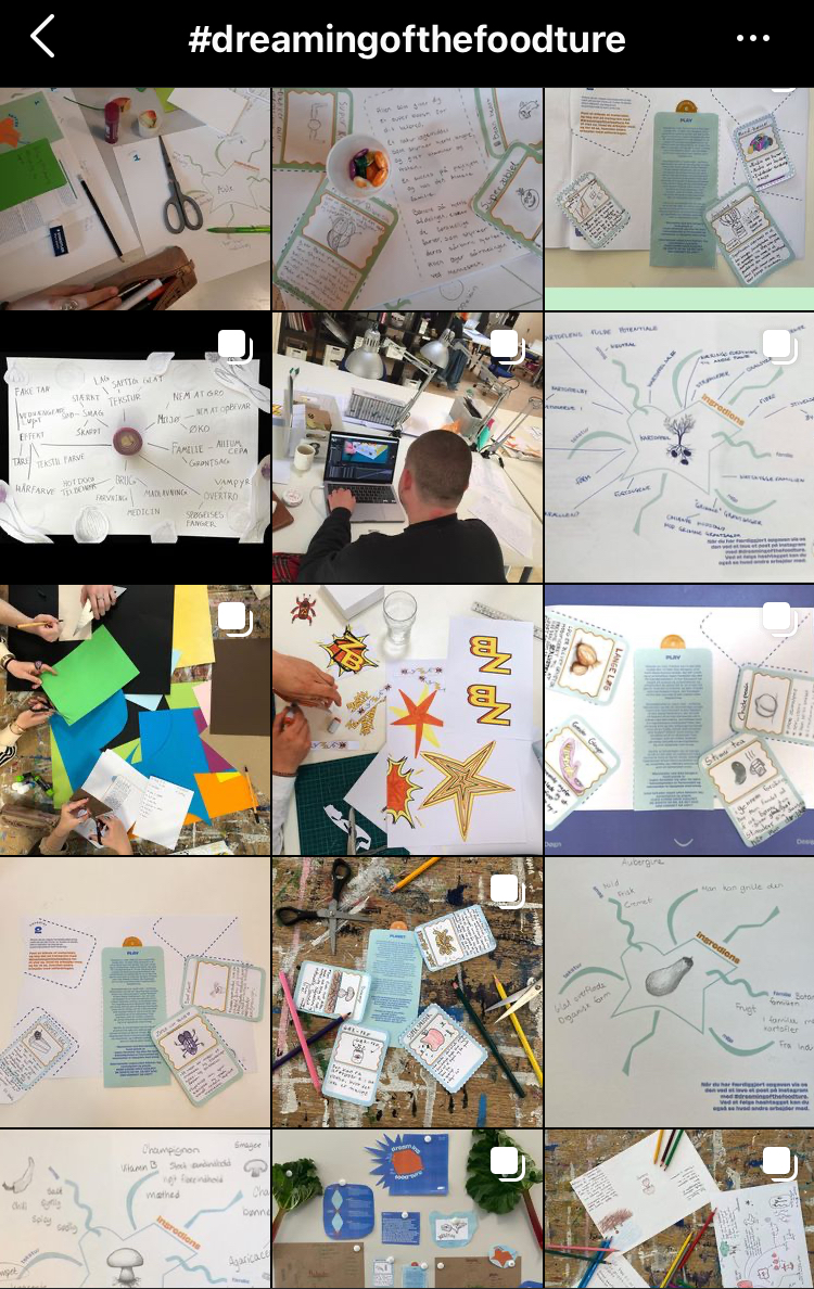 The visual identity consists of a library of combinable abstract shapes, inspired by food elements, complemented by stickers to help guide the workshop process. The main workshop material is a printable A3 manual used as exercise sheet for students to fill out and expand with tangible objects. The entire event being held online, through Designskolen Kolding’s Instagram account, the visual identity unfolds through motion design and Instagram Stories, to ease the participation of class groups all over Denmark. #dreamingofthefoodture